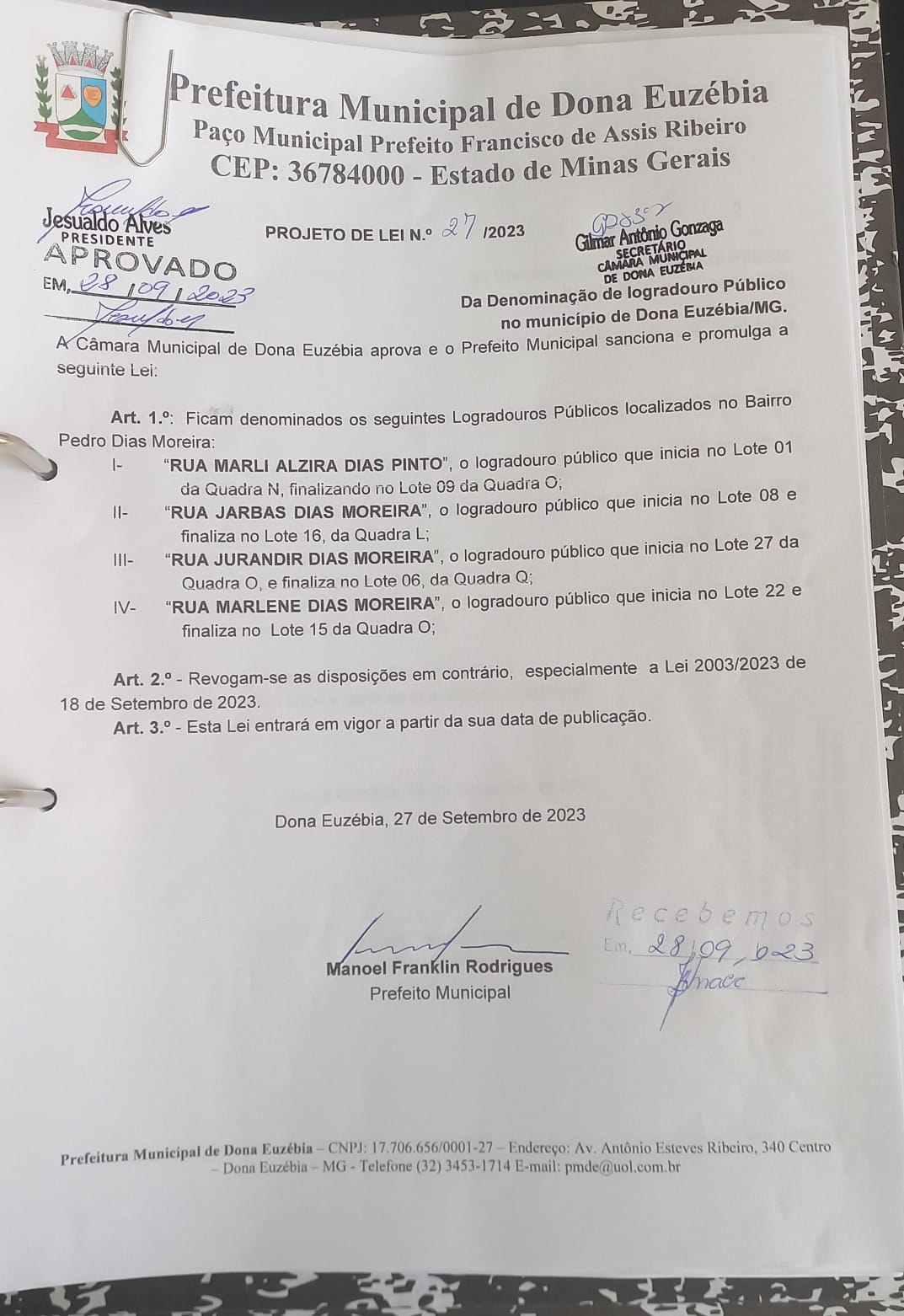 PROJETO DE LEI Nº027 DENOMINAÇÃO DE LOGRADOURO PUBLICO