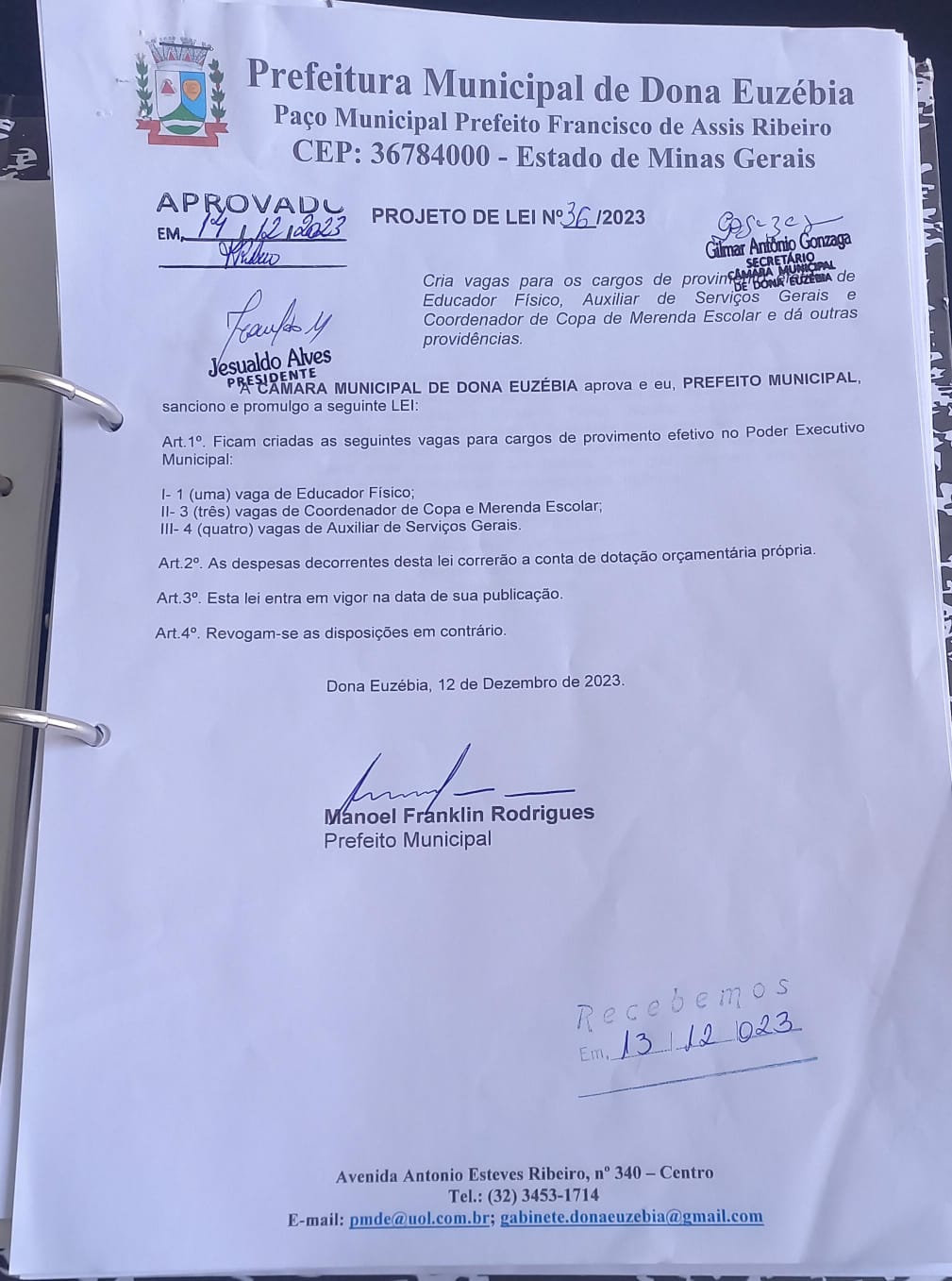 PROJETO DE LEI Nº 36-23 CRIA VAGAS PARA OS CARGOS DE PROVIMENTO EFETIVO DE EDUCADOR FISICO ENTRE OUTROS.
