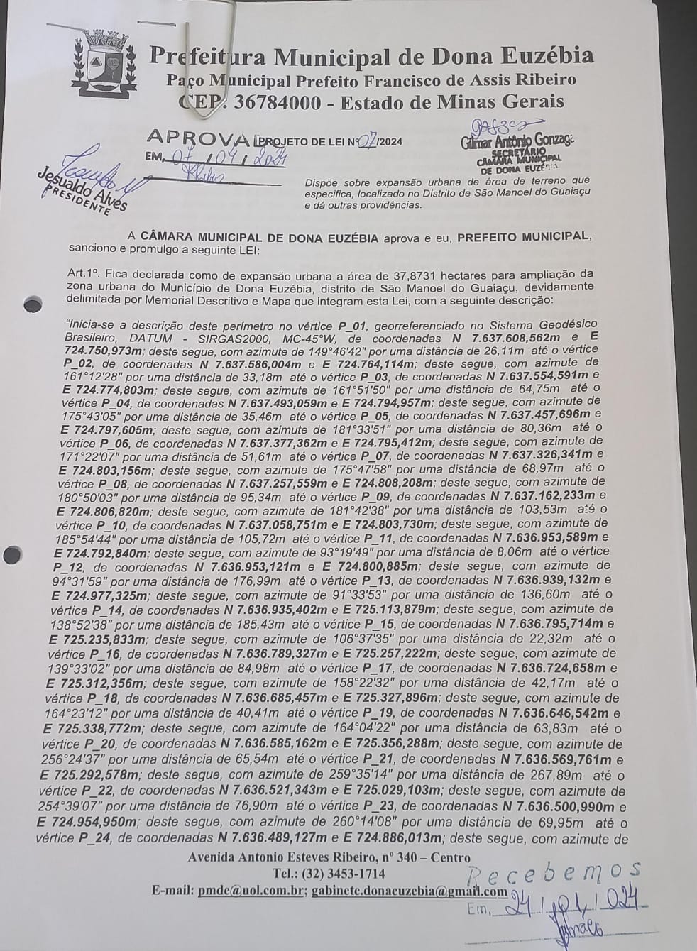 PROJETO DE Nº07-24 DISPÕE SOBRE EXPANSÃO URBANA DE ÁREA DE TERRENO QUE ESPECIFICA...